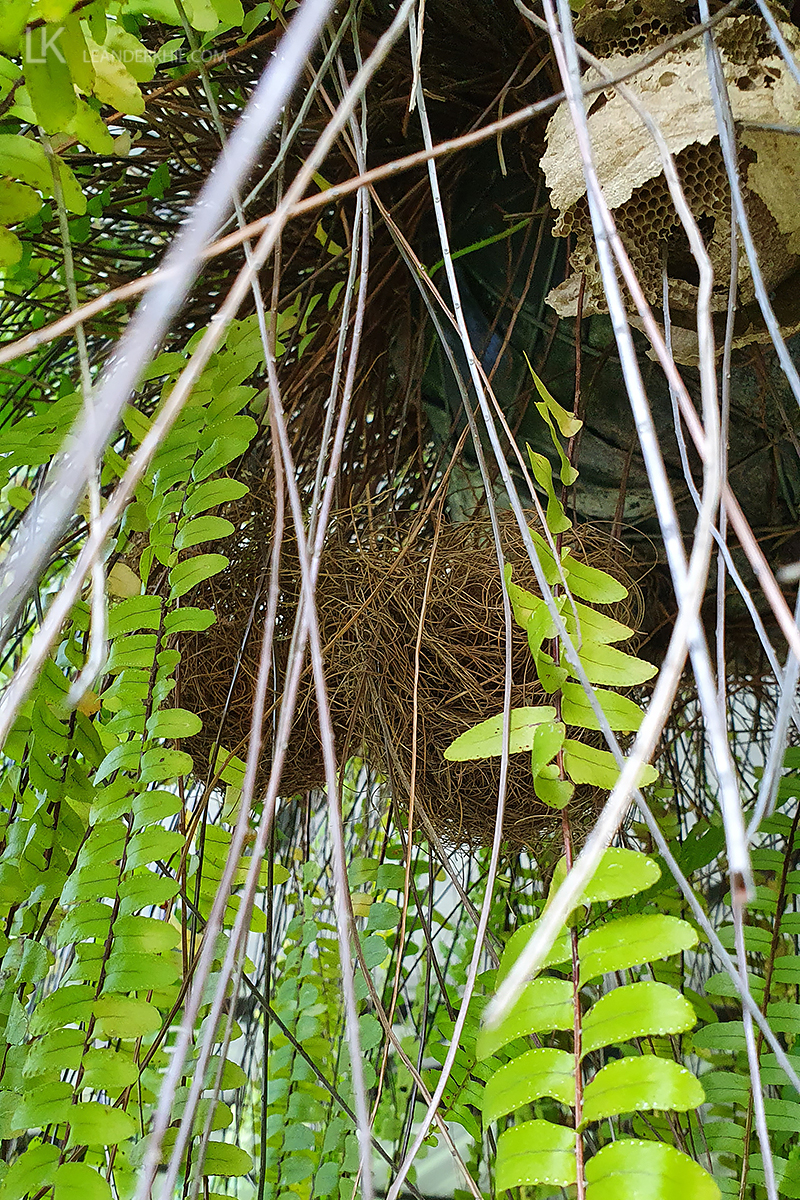 While at Finca La Gracia (Escuintla, Guatemala), I was showed a nest (two side by side actually) of Spot-breasted Orioles / Tropfentrupiale (Icterus pectoralis) that were constructed unusually low under a hanging flower pot right next to the Finca. The birds had woven them into hanging fern leaves, just about 1.8 meters above the ground. The nests were neat cups of plant fibres, but not the long, hanging pouch that is usually expected. I suspect that the pouch structure, which could serve as a roof to avoid detection/access by predators, becomes obsolete in such a well-covered situation. According to H. Pasch, the birds had reused one of the two nests in multiple seasons. On my visit on 4 March 2020, the pair had started to work on their nest for the coming breeding season.